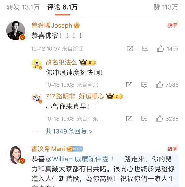 两人官宣后马上上了热搜,好友曾舜晞和经纪人霍汶希第一时间就发了道喜文。惠英红和谭耀文爷随后恭喜他们,所有人都真心为他们感到开心。