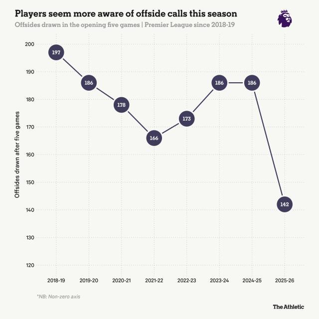 另一个细节是,在半自动越位判定系统引入英超已5个月的情况下,球员们似乎对越位有了更高警惕,本季越位总数对比此前几年显著下跌,只有142次,此前几年多在170-200之间。此中另一成因或许是各队主动或被动减少了直塞球。本季迄今整个英超只有59次成功直塞,也就是平均一场才1.18次,这是2021-22赛季以来的同期最低值。