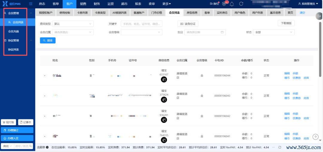 禧住云PMS会员管理界面